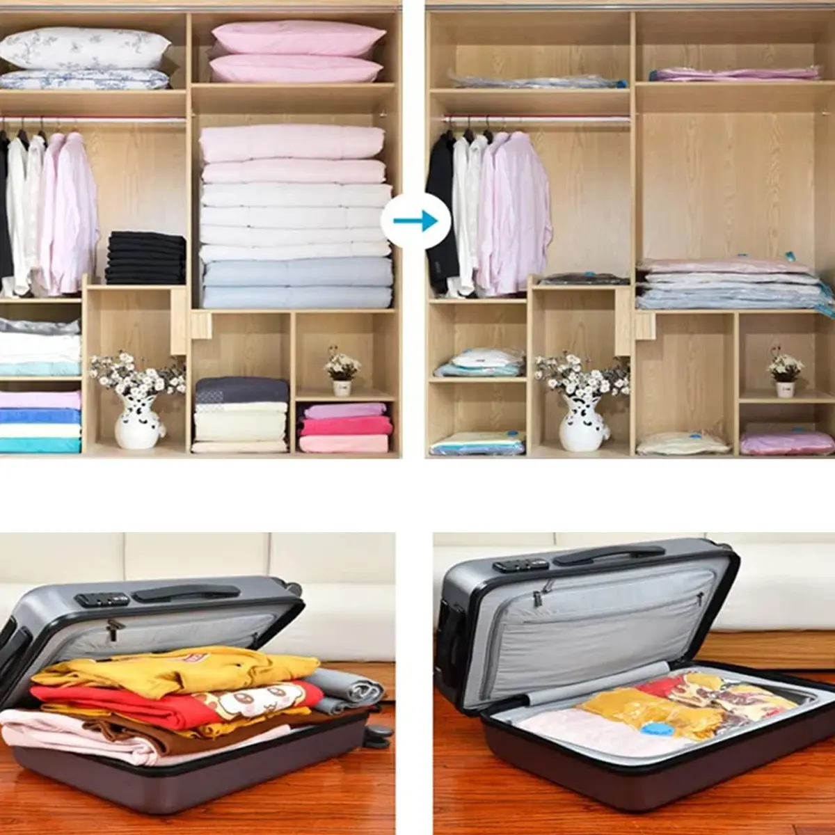 Sparen Sie mehr Stauraum: Sie haben eine starke Kompressionsfunktion, die jedes bisschen Luft entfernt, das Ihren begrenzten Platz zu Hause oder im Gepäck vergrößert, und arbeiten mit jedem Staubsauger zusammen, um Platz zu sparen
